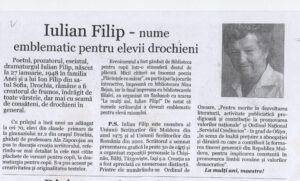 Poetul, prozatorul, eseistul, dramaturgul Iulian Filip, născut la 27 ianuarie, 1948 în familia Anei și a lui Ion Filip din satul Sofia, Drochia, rămâne a fi creatorul de frumos, îndrăgit de toate vârstele, dar mai cu seamă de consăteni, de drochieni în general.