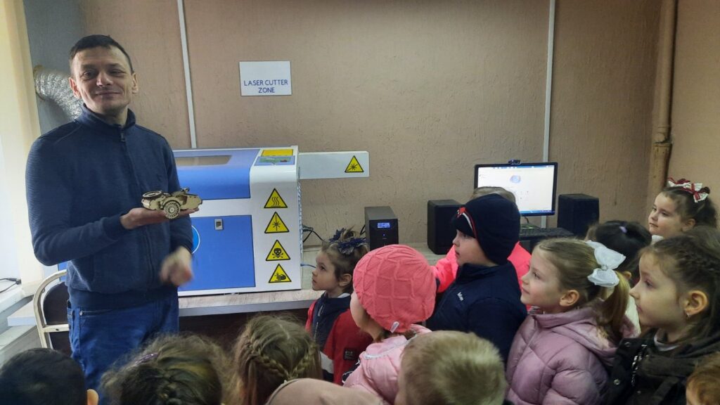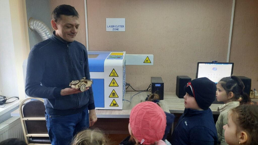 Surpriza zilei a continuat în laboratorul FabLab, unde colaboratorul bibliotecii, Dinu Cantemir, le-a deschis copiilor o altă lume – a creației și a tehnologiilor. Cu răbdare și pasiune, le-a prezentat lucrări realizate în laborator, stârnind uimire, întrebări și mult entuziasm. Pentru cei mici, a fost ca o fereastră spre viitor, unde imaginația prinde formă.